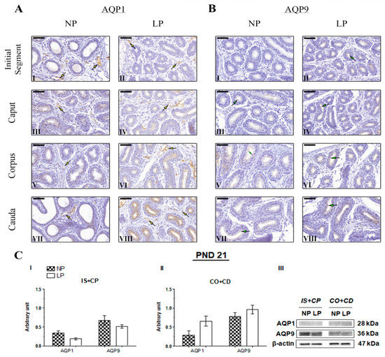 Immunolocalization of AQP9 was observed in the stereocilia of epididymis principal cells in NP and LP animals at all investigated ages. AQP9 immunostaining appears weak in the initial segment, weak to moderate in the caput, and intense in the corpus and cauda epididymis of 21-day-old animals [36,40]. No AQP9 immunoreactivity was observed in the initial segment of the epididymis of NP animals on PND 21 (Figure 4B(I)). However, in both groups, the intensity of AQP9 staining was weak in the epididymis caput (Figure 4B(III,IV)), strong in the corpus (Figure 4B(V,VI)), and moderate in the cauda at this age (Figure 4B(VII,VIII), thereby revealing a segment-dependent function. The intensity of AQP9 staining was slightly higher in the epididymal cauda of LP animals compared with NP animals (Figure 4B(VIII)).