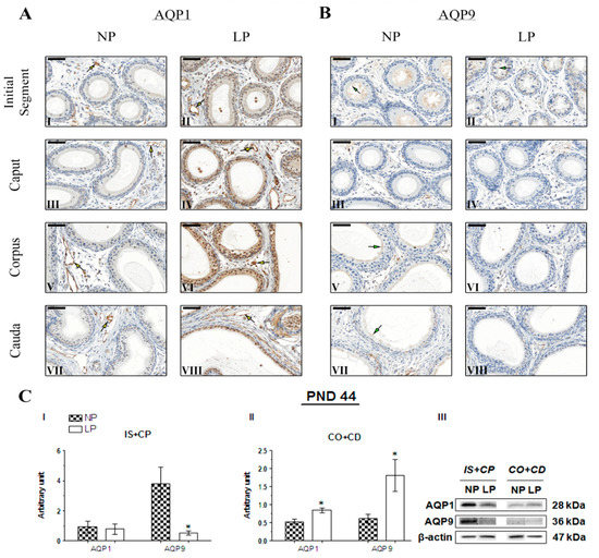 In the 44-day-old NP animals, strong labeling for AQP9 was observed in stereocilia of principal cells in the initial segment (Figure 5B(I)). In the caput epididymis, the staining disappeared (Figure 5B(III)), and was only intensified in the corpus and cauda of the organ (Figure 5B(V,VII)). In PND 44 LP animals, slightly less intense AQP9 staining was observed in the initial segment than in the NP group (Figure 5B(II)), and staining was not observed in caput, corpus, and cauda epididymis (Figure 5B(IV, VI and VIII)). However, AQP9 expression in these regions was also observed and quantified using Western blotting, probably due to the higher sensitivity of the technique.
