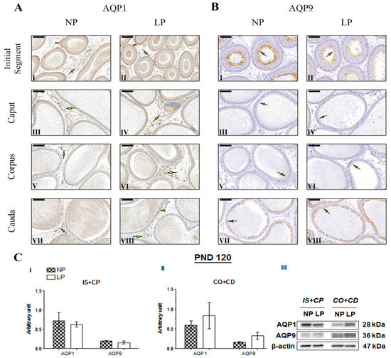 At PND 120, NP animals showed intense AQP9 staining in the initial segment and cauda epididymis (Figure 6B(I,VII)), corroborating the data from literature [25,37,38,39,40]. At PND 120, slightly less intense AQP9 staining was observed in the initial segment of LP animals than in NP animals (Figure 6B(II)), whereas no differences were observed in the intensity of AQP9 staining in the caput, corpus, and cauda epididymis between NP and LP animals (Figure 6B(III–VIII)).
