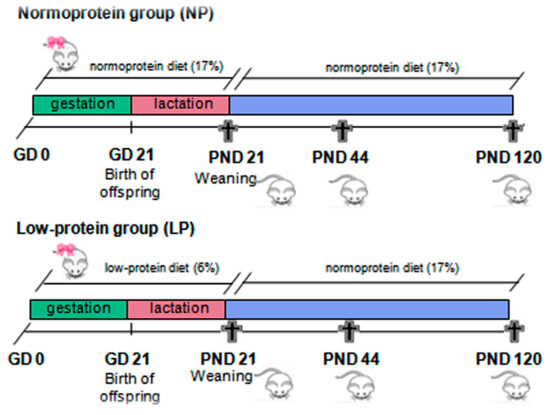 The experimental design. Pregnant females were fed with low-protein diet (LP group) or normoprotein diet (NP group) ad libitum during gestation and lactation from GD 0 until PND 21. After weaning, male pups from both groups received the standard diet for rodents until the ages of 21, 44, and 120 days.