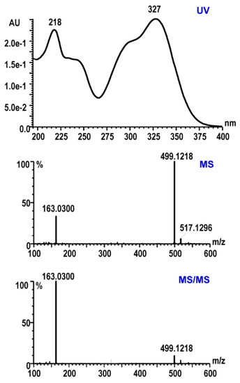 m/z 499.1218, 355.0952, 337.0863, and 163.0300 Da, respectively, correspond to [M-H