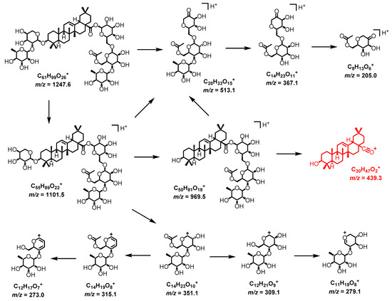 9]. In earlier studies, Liu’s research team summarized the fragmentation patterns of flavonoids and triterpene glycosides by tandem mass spectrometry [