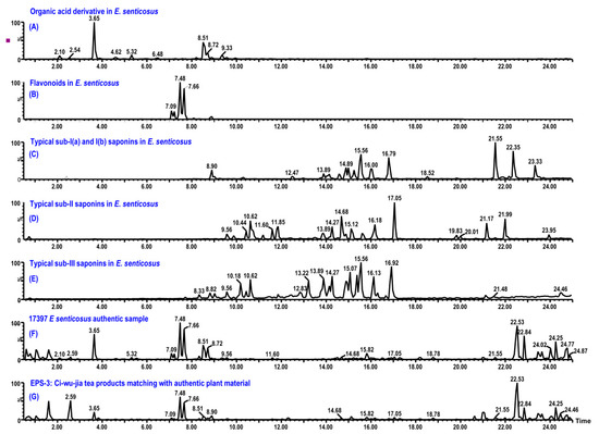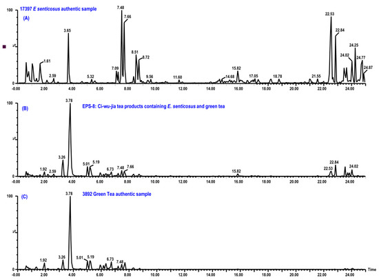 E. senticosus leaves using a single ultra-high performance liquid chromatography (UHPLC) method coupled to photo-diode array (PDA) and quadrupole time-of-flight mass Spectrometer (QToF MS) detectors. Compounds’ characterization was carried out by combining UV, MS, and MS/MS data with the informatics platform, UNIFI. Characteristic UV, MS, and MS/MS spectra of typical compounds in each class were defined. The commonly observed fragment ions and neutral loss were determined and edited into the UNIFI processing method. The UHPLC-UV-MS/MS data of authentic plant samples were processed and marker compounds were confirmed by comparison with the retention time, UV and MS spectra, as well as the MS/MS fragmentation pattern of reference standards and the literature. The analyzed samples or products not fully matched with the authentic material were identified. Compounds causing the differences in those non-matching samples/products were determined and characterized using the established personal library. In total, 13 plant samples collected from different locations and 11 ci-wu-jia teas were tested using the developed method. Out of the 11 ci-wu-jia tea samples, three (EPS-1, EPS-2, and EPS-8) products were determined to contain caffeine, epigallocatechin, epicatechin, epigallocatechin gallate, and epicatechin gallate; all compounds that matched with the profile of green tea extract. These results indicate that the products, EPS-1, EPS-2, and EPS-8, contained green tea. However, green tea was a non-listed ingredient on the products’ label and is considered to be an adulterant in these Ci-wu-jia tea products. To the author’s knowledge, this is the first comprehensive study for the development of a single analytical method for the chemical compounds in