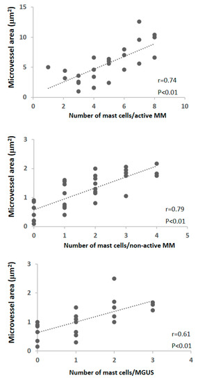 Mast cell counts in comparison with the microvessel area in the bone marrow of patients with active and non-active multiple myeloma (MM) and with monoclonal gammopathy of undetermined significance (MGUS). Significance of the regression analysis was calculated by the Pearson’s (r) test. (Modified from reference [46]).