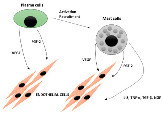 Within the bone marrow microenvironment, bone marrow stromal cells, hematopoietic stem cells, fibroblasts, osteoblasts/osteoclasts, adipocytes, endothelial precursor cells, T lymphocytes, macrophages, and mast cells, increase the concentration of angiogenic factors and matrix degrading enzymes in the bone marrow microenvironment by direct secretion or following stimulation by myeloma cells or by endothelial cells through paracrine interaction [75].