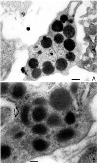 Ultrastructural findings of bone marrow biopsies from patients with active multiple myeloma. In (A), a mast cell with typical electron-dense round granules and in (B), at higher magnification, a cytoplasmic granule with a semilunar aspect (arrow), among other typical round granules, is recognizable. Bars, (A) 0.08 μm; (B) 0.02 μm (Reproduced from reference [46]).