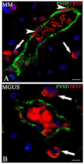 Double FVIII-RA (green) and tryptase (red) confocal laser microscopy from multiple myeloma (MM) (A) and monoclonal gammopathy of undetermined significance (MGUS) (B) bone marrow biopsy specimens. In (A), a MM vessel is lined by both endothelial cells positive for FVIII-RA and by mast cells positive for tryptase (arrowheads). Mast cells containing tryptase-positive granules (arrows) are also recognizable on the abluminal side of the vessel. In (B), a MGUS vessel is lined only by endothelial cells positive for FVIII-RA and is surrounded by tryptase-positive mast cells (arrows). Bars, (A) 15.8 μm; (B) 12.5 μm (Reproduced from reference [77]).