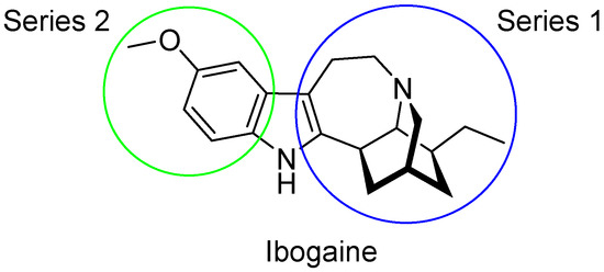 Ibogaine (Figure 1), a psychoactive indole alkaloid, is a typical “dirty drug” with high affinity for a panel of targets including NMDA, κ- and µ-opioid receptors and σ2 receptor sites [22]. Ibogaine has also shown to interact with the acetylcholine, serotonin, and dopamine systems and to modify the expression of some proteins including substance P and brain-derived neurotrophic factor (BDNF) [23,24]. Initially used for its hallucinogenic properties, ibogaine has been then investigated for its potential in treating drug abuse [25]. However, little research in humans has been done due to the severe side effects and death following its ingestion, including tremors, neurotoxicity, and cardiotoxicity [26].