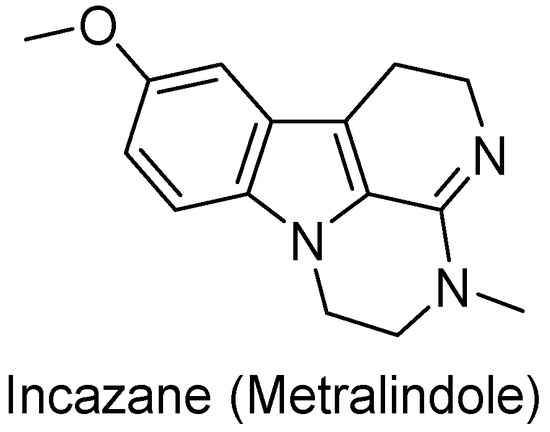 - Andreeva, N.I.; Asnina, V.V.; Liberman, S.S. Domestic Antidepressants. 3. Incazane (Metralindole). Pharm. Chem. J. 2001, 35, 59–62. [Google Scholar] [CrossRef]