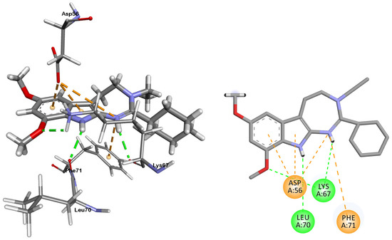A representation of the best docked pose for compound 2_4 is depicted in Figure 3. There are clearly visible two hydrogen bonds between the LYS67 and LEU70 with the two hydrogen atoms at nitrogens and another one between LYS67 and a methoxyl oxygen atom. Moreover, two π-ion interactions were established between the ASP56 and the two aromatic rings of the indole and another two between the ASP56 and PHE71 with the π-orbital of the nitrogen atom of the 1,3-diazepine ring. A comparison of the best docked poses for ibogaine, pinoline and compound 2_4 are reported in Figure S3.