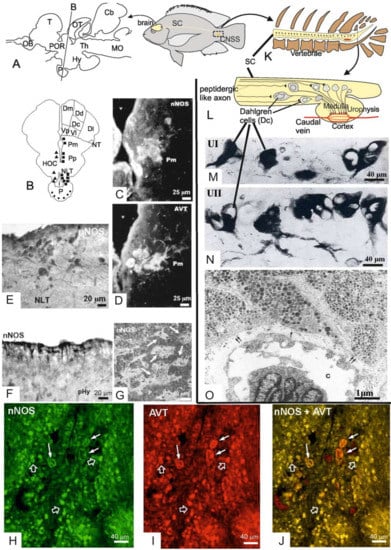 Hypophysiotropic (A–J) and caudal neurosecretory (K–O) systems in teleosts. (A,B): schematic representation of longitudinal (A) and transverse (B) sections of the brain of adult Oreochromis niloticus showing the distribution of Nos1-immunoreactive (square) and NADPHd reactive (triangle) nerve cells. In the pituitary gland (P), dots represent Nos1-ir hypothalamo-hypophysial fibers and pituitary cells. (C,D): Fluorescence micrographs of consecutive transverse sections through the magnocellular preoptic nucleus (Pm) immunostained for Nos1 (C) and AVT (D). Note that Nos1 and AVT are colocalized in the same neurons. (E): Nos1 immunohistochemistry showing labelled neurons in the lateral zone of the nucleus lateralis tuberi (NLT). (F): Nos labelled CSF-contacting neurons in the pHy. (G): Fluorescence photomicrograph of the neurointermediate lobe (NIL) of the pituitary gland immunolabelled for Nos1. High magnification showing the distribution of Nos1-ir in the pericapillary areas (arrows). (H–J) Transverse sections of the Pm and the hypophysis of O. niloticus single and double immunolabeled for Nos1 and AVT. Nos1 positive cells are green (490 nm excitation, FITC), AVT-positive cells are red (545 nm excitation, Cy3), while regions of colocalization are lemon green, yellow or orange. Magnocellular neurons immunoreactive for both Nos1 and AVT (arrows). Note the large number of small neurons immunoreactive for Nos1/AVT (open arrows). (K,L): schematic representation of the terminal tract of the spinal cord showing teleost CNSS characterized by the presence of Dahlgren cells sending their axons to the urophysis. (M,N): Large Dahlgren cells immunostained respectively for UI and UII in C. auratus. (O): Electron micrograph of the urophysial cortex. Large granules- (single arrows) and small granules-containing (double arrows) axon terminals are shown. c: capillary. Scale bars are reported. Abbreviations. Cb: cerebellum; CNSS: caudal neurosecretory system; D: area dorsalis telencephali; Dc: D pars centralis; Dd: D pars dorsalis; Dl: D pars lateralis; Dm: D pars medialis; HOC: horizontal commissure; Hy: hypothalamus; i: infundibulum; MO: medulla oblongata; NLT: nucleus lateralis tuberis; NT: nucleus tenia; OB: olfactory bulb; OT: optic tectum; P: pituitary gland; pHy: periventricular hypothalamus; Pm: magnocellular preoptic nucleus; POR: preoptic region; Pp: parvocellular preoptic nuclei; SC: spinal cord; T: telencephalon; Th: thalamus; Vl: area ventralis telencephali, pars lateralis; Vp: area ventralis telencephali, pars postcommissuralis.