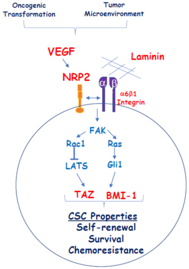 One proposed mechanism for how vascular endothelial growth factor/neuropilin (VEGF/NRP) signaling impacts cancer stem cell (CSC) function independently of VEGFRs. Oncogenic transformation and conditions in the tumor microenvironment result in the establishment of autocrine VEGF/NRP2 signaling in tumor cells that contributes to the genesis of a CSC phenotype. VEGF/NRP2 signaling facilitates α6β1 integrin engagement with laminins such as laminin 511 in a CSC niche. Signaling through this integrin activates a focal adhesion kinase/Ras pathway that promotes the Gli1-mediated expression of B lymphoma Mo-MLV insertion region 1 homolog (BMI-1), a stem cell factor. VEGF/NRP2 signaling also promotes the repression of LATS by Rac1 and the consequent activation of the stem cell factor and Hippo effector TAZ. The convergence of these signaling pathways contributes to the acquisition of stem cell properties including self-renewal, survival, and chemoresistance.