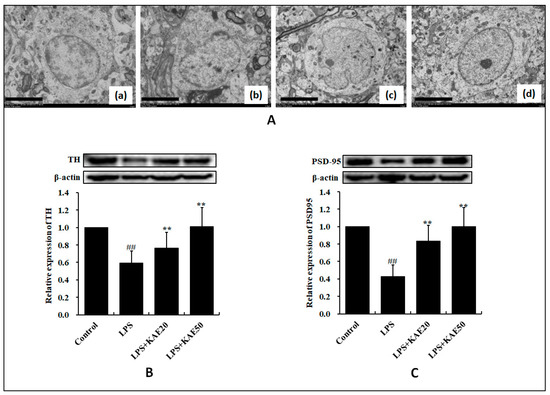 The ultrastructures of the striatum tissues were observed by electron microscopy. In the control group, the nucleolus exhibited a clear boundary, and the nuclei of neuronal cells appeared large and round (Figure 1Aa). Conversely, after LPS injury the neurons were markedly swollen and exhibited signs of apoptosis, such as nuclear envelope shrinkage (Figure 1Ab). However, the neuron damage improved in the KAE treatment group (Figure 1Ac,d). In addition, when compared with the control group, LPS reduced the expression of TH and PSD95 in the striatum (both p < 0.01). However, KAE can significantly improve the expression level of TH (Figure 1B) and PSD95 (Figure 1C) as compared with the LPS-induced group (p < 0.01).