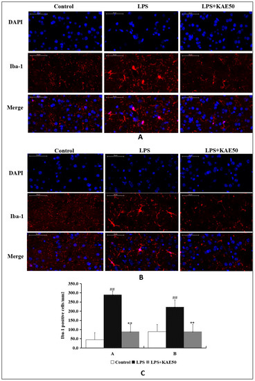 To observe whether KAE inhibits the activation of microglia, we performed immunofluorescence staining by Iba-1 for KAE 50 mg/kg group. Treatment of mice with LPS increased the levels of Iba-1 both in ventral striatum (Figure 2A) and in dorsal striatum (Figure 2B). KAE treatment inhibited the expression of Iba-1 in the striatum tissues of LPS-injured mice. This finding indicates that KAE inhibits the activation of Iba-1 following stimulation of mice by LPS.