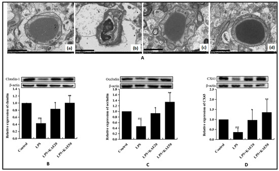 The blood-brain barrier is composed of a microvascular endothelium and intercellular tight junction, astrocytes, and basement membrane. BBB integrity by Evance Blue staining was investigated in our previous article [17]. Therefore, in this study, we focused on the ultrastructure of BBB observed using electron microscopy and tight junction proteins determined by WB. In the control group, the endothelial cells were closely interconnected and no edema was detected in the area surrounding the capillaries (Figure 3Aa). Conversely, the endothelial cells protruded towards the cavity and the capillaries were shrunken and deformed in the LPS-injured group. The extension of the astrocytes in the BBB swelled and vesicles were formed (Figure 3Ab). However, KAE treatment markedly attenuated ultrastructure destruction of BBB injured by LPS in the striatum tissue and improved the edema of the astrocytes and the area surrounding the capillaries (Figure 3Ac and Figure 3Ad). In addition, as the tight junction proteins, such as occludin, claudin-1, and CX-43, play important roles in maintain BBB integrity; these proteins were also examined in the striatum. In LPS-injured mice, levels of occludin (Figure 3B, p < 0.01), claudin-1 (Figure 3C, p < 0.01), and CX-43 (Figure 3D, p < 0.01) in the striatum of mice were all decreased significantly when compared with the control group. However, treatment with KAE 20 mg/kg and 50 mg/kg both significantly improved the proteins expression of claudin-1, occludin, and CX-43. These results suggest that KAE can reduce BBB damage injured by LPS to a certain extent.