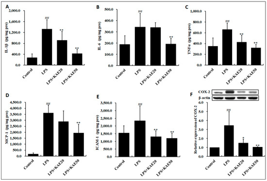Recognizing that BBB compromise is associated with inflammation in the striatum, we further analyzed expression of inflammatory cytokines, chemokine, cell adhesion molecule, and cyclooxygenase-2 (COX-2). LPS stimulated the release of interleukin 1β (IL-1β) (Figure 4A, p < 0.01), interleukin 6 (IL-6) (Figure 4B, p < 0.01), tumor necrosis factor α (TNFα) (Figure 4C, p < 0.01), monocyte chemotactic protein-1 (MCP-1) (Figure 4D, p < 0.01), ICAM-1 (Figure 4E, p < 0.01), and COX-2 (Figure 4F, p < 0.01). However, KAE dose-dependently suppressed the production of pro-inflammatory cytokines and chemokines involving IL-1β, IL-6, TNFα, MCP-1, ICAM-1, and COX-2 injured by LPS in the striatum of mice.