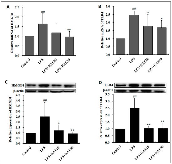 LPS injury significantly increased the level of HMGB1and TLR4 both on the mRNA level and the protein level (all p < 0.01, Figure 5) in the striatum of mice. However, KAE administration inhibited the expression of HMGB1 and TLR4 proteins. These finding indicates that KAE down-regulated the HMGB1/TLR4 inflammatory pathway in striatum of mice.