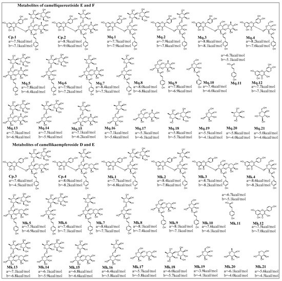 Proposed hydrolysis metabolites of acylglycosides flavones and docking score analysis of their inhibitory abilities on α-glucosidase (a) and HMG-CoA reductase (b). Among camelliquercetisides, metabolites Mq.3 and prototype Cp.2 (camelliquercetiside F) exhibited excellent inhibitory activities on α-glucosidase and HMG-CoA reductase at −8.8 kcal/mol and −9.0 kcal/mol, respectively. For camellikaempferosides, metabolites Mk.3 exhibited good inhibitory activities on α-glucosidase at −8.7 kcal/mol, Cp.4, Mk.3 and Mk.4 were calculated as the good inhibitors on HMG-CoA reductase.