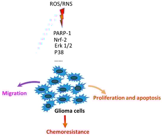 In general, high levels of Reactive Oxygen Species (ROS) and Reactive Nitrogen Species (RNS) are highly involved in the malignancy of gliomas, as well as in chemoresistance due to the activation of different signaling mediators, such as poly(ADP-ribose)polymerase (PARP-1), Mitogen-Activated Protein Kinases (MAPKs), nuclear factor erythroid 2-related factor 2 (Nrf-2) and many others (Figure 1).