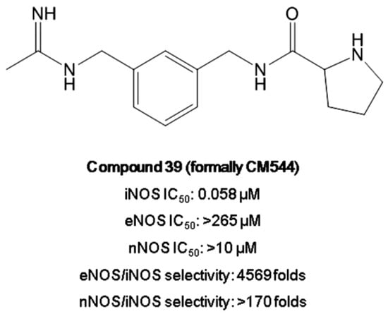As part of an ongoing project on the research of new NOSs modulators [,,,], we disclosed N-(3-{[(1-iminioethyl)amino]methyl}benzyl)prolinamide dihydrochloride (compound 39, formally CM544, Figure 2), a new potent iNOS inhibitor, showing high selectivity with respect to the constitutive endothelial and neuronal NOSs (iNOS IC50 = 0.058 μM; eNOS/iNOS selectivity = 4569 folds; nNOS/iNOS selectivity > 170 folds, Figure 1) []. From the chemical viewpoint, it is an acetamidine bearing a proline moiety designed with the aim to exploit the subtle differences between the NOSs active sites.