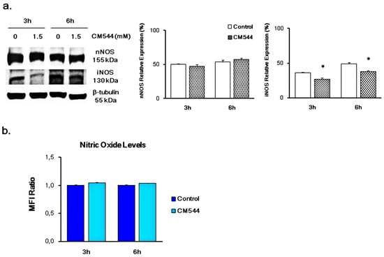 The effect of CM544 on the expression of NOSs was evaluated by means of immunoblotting after 3 and 6 h of exposure to 1.5 mM. The expression of the constitutive isoforms nNOS was not affected by the treatment, being the protein bends similar over the time of the culture and the treatments (Figure 3a). In contrast, iNOS was clearly down-regulated after 3 h of exposure to CM544 with respect to untreated cells (27% vs. 36%). After 6 h, iNOS expression increased in untreated cultures, having slightly decreased after exposing cells to CM544 with respect to a 3 h treatment (Figure 3a).