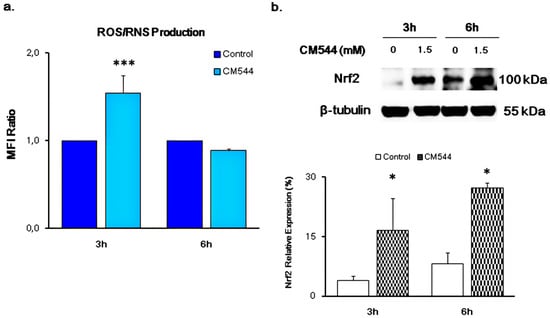 As shown in Figure 4a, increased intracellular levels of oxidative and nitrosative stress were widely and consistently observed in glioma cells exposed to 1.5 mM of CM544 for 3 h. However, CM544 was ineffective after longer exposure time, being the Mean Fluorescence Intensity (MFI) ratio of a 6 h treatment comparable to the one of UC. Early exposures (3 h) of CM544 also triggerred Nrf-2 expression and the increment was further enhanced after 6 h (16.7% and 27.3%, respectively) (Figure 4b).