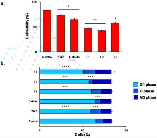 To compare the biological effects of the commercial chemotherapeutic agent TMZ to CM544, metabolic activity and cell cycle progression of C6, rat glioma cells were analyzed after treating cells with the two agents separately and together (Figure 7). TMZ 500 µM significantly reduced cell metabolic activity after 24 h and 48 h of treatment (88.44% and 56.58% of metabolizing cells for TMZ and T1, respectively; Figure 7a) Notably, 1.5 mM CM544 administered at the same experimental times enhanced cell viability fall, being the percentages of active metabolizing cells assessed at 77.85% and 51.34%, respectively (CM544 and T2; Figure 7a). When cell cultures were pre-incubated with 1.5 mM CM544 for 24 h and then co-treated with CM544 and TMZ for further 24 h, cell metabolic activity was assessed at 69.76% (T3; Figure 7a). As expected, 500 µM TMZ reduced percentage of cells found in the G1 phase with respect to untreated control (71% vs. 78.1%) after 24 h and 48 h (71.93%) (Figure 7b). The administration of 1.5 mM CM544 was slightly effective on the G1 phase after 24 h, exerting its antiproliferative effect at 48 h, as shown by the percentage of cells in the G1 phase assessed at 69.52%. More relevant, CM544 significantly decreased the percentage of cells found in the S phase of the cell cycle with respect to the untreated control after 24 h (7.52% vs. 10.96%) and even more after 48 h of treatment (3.59%). When cells were pre-incubated with 1.5 mM CM544 and afterwards exposed to TMZ and CM544 in parallel (T3; Figure 7b), the percentage of cells in the G1 phase was the lowest value registered, being assessed at 61.14%.