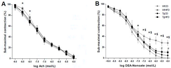 (A) Concentration-response curves to acetylcholine in wild type (Wt) and transgenic mice (Tg) overexpressing unacylated ghrelin fed a control (CD) or a high-fat diet (HFD). Vascular reactivity studies were performed on aortic segments from each group. * p ≤ 0.05 WtHFD vs. WtCD. n = 7 animals/group. Contractions to phenylephrine were similar among the experimental groups. (B) Concentration-response curves to DEA-NONOate in the same groups. * p ≤ 0.05 vs. WtCD. $ p < 0.05 TgHFD vs. WtHFD. # p < 0.05 TgHFD vs. WtCD. Contractions to phenylephrine were not significantly different in the four groups. n = 7 animals/group.