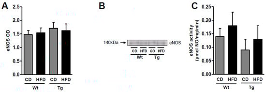 The eNOS expression was comparable in aortas from wild type and UnGhr-overexpressing transgenic animals, both under the control and high-fat diet conditions (Figure 2A,B). Accordingly, eNOS activity was not different between vessels from lean and obese HFD-fed animals from both genotypes (Figure 2B).