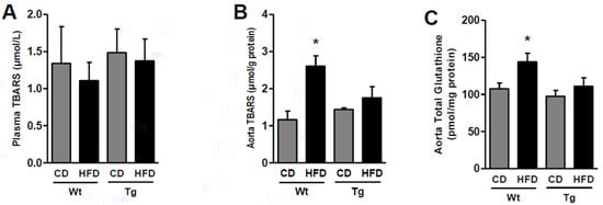Systemic and vascular oxidative stress and antioxidant potential. Quantitative analysis of plasma (A) and aortic (B) thiobarbituric acid reactive substances (TBARS) and tissue total glutathione (C) in control (Wt) and transgenic (Tg) mice fed the control diet (CD) or the high-fat diet (HFD). The data represent seven mice per group. * p < 0.05 vs. other groups.