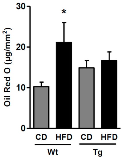 Lipid accumulation quantified by Oil Red O (ORO) staining in the aortas from control (Wt) and transgenic (Tg) mice fed the control diet (CD) or the high-fat diet (HFD). * p < 0.05 vs. WtCD.