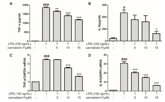 Cannabisin F inhibited IL-6 and TNF-α production (A,B) and their mRNA expression (C,D) in LPS-stimulated BV2 microglia cells. BV2 microglia cells were pretreated with cannabisin F (5, 10 and 15 µM) for 1 h and then stimulated with LPS at 100 ng/mL for 24 h. The supernatants were harvested and the secretion of TNF-α (A) and IL-6 (B) were measured by ELISA. For qRT-PCR analysis, the mRNA levels of TNF-α (C) and IL-6 (D)were determined after incubation with LPS at 100 ng/mL for 6 h. The data are presented as mean ± SD from at least three independent experiments. *p < 0.05, **p < 0.01, ***p < 0.001 as compared to the cells treated with LPS; #p < 0.05, ###p < 0.001 as compared to the control.