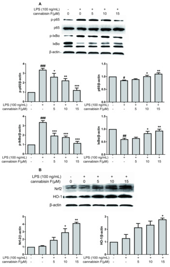 Cannabisin F inhibited the phosphorylation of IκBα, p65, but enhanced the expression of Nrf2 and HO-1 in LPS-stimulated BV2 microglia cells. (A) BV2 microglia cells were pretreated with cannabisin F (5, 10 and 15 µM) for 1 h prior to stimulation with LPS at 100 ng/mL for 1 h. Cell extracts were then prepared and subjected to Western blot with antibodies against IκBα, phospho-IκBα, p65, and phospho-p65. (B) BV2 microglia cells were pretreated with cannabisin F (5, 10 and 15 µM) for 1 h prior to stimulation with LPS at 100 ng/mL for 24 h. Cell extracts were then prepared and subjected to Western blot with antibodies against Nrf2 and HO-1. β-actin was used as the internal control for normalization. The results are presented as mean ± SD from at least three independent experiments. *p < 0.05, **p < 0.01, ***p < 0.001 as compared to the cells treated with LPS; #p < 0.05, ##p < 0.01, ###p < 0.001 as compared to the control.