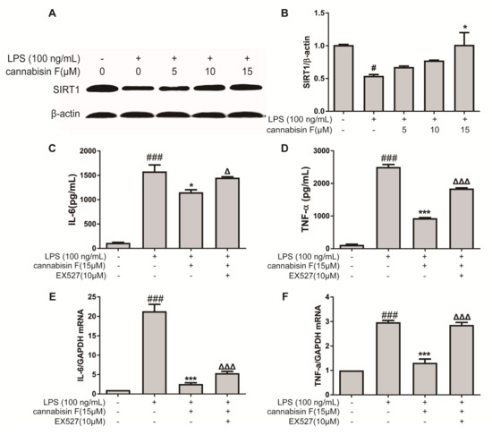 To further evaluate the role of SIRT1 on the anti-inflammatory effect of cannabisin F, BV2 microglial cells were treated with LPS and cannabisin F with or without SIRT1 inhibitor EX527. BV2 cells were pre-treated with EX527 at 10 µM for 1 h, followed by treatment with cannabisin F (15 µM) for 1 h and then stimulation with LPS at 100 ng/mL for 24 h. The inflammatory cytokines were measured by ELISA. As shown in Figure 6, cannabisin F alone significantly reduced LPS-induced IL-6 (Figure 6C) and TNF-α (Figure 6D) production as compared to LPS group. However, when SIRT1 was blocked with the inhibitor EX527, the ability of cannabisin F to reduce LPS-induced inflammatory cytokines was abolished (Figure 6C–F). This finding suggests that the ability of cannabisin F to reduce LPS-induced inflammatory cytokines is SIRT1-dependent.