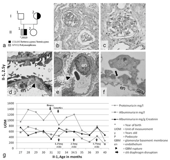 (a) Pedigree of case 1. (b–f) Nephropathological evaluation of the kidney biopsy of patient II-1. (b,c) Light microscopy showing focal segmental glomerulosclerosis (FSGS) and slight mesangial matrix expansion. (d–f) Ultrastructural analysis showing gross broadening of the podocyte foot processes; partial loss of the slit diaphragm (black arrow); and splitting, thinning, and ruptures of the glomerular basement membrane (GBM) (arrowhead). (g) The course of disease during ACE-inhibitor therapy: proteinuria constantly decreased (arrow). The diagnostic timescale is indicated by the blue arrows. Magnification: (b,c) 400×, (d) 20,000×, (e) 8000×, (f) 25,000×.