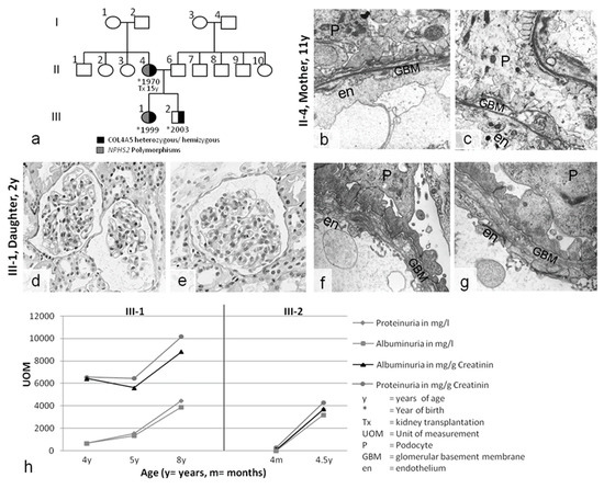 Case 2 was an Austrian family with severe kidney disease in the mother, daughter, and son (Figure 2). The mother presented with hematuria and proteinuria in childhood. She soon developed ESRD and received a kidney transplant from her father at the age of 15. Her kidney biopsy at 11 years of age revealed advanced FSGS, hyalinosis, tubulointerstitial foam cells, podocyte effacement, splitting, lamellations, and partial thinning of the GBM. AS was considered; however, due to the unusual nature of a severe manifestation in a girl with healthy parents, she was diagnosed as having FSGS and nephrotic syndrome, with secondary structural changes in the GBM (Figure 2b,c).