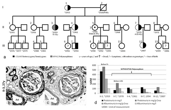 - Jais, J.P.; Knebelmann, B.; Giatras, I.; De Marchi, M.; Rizzoni, G.; Renieri, A.; Weber, M.; Gross, O.; Netzer, K.O.; Flinter, F.; et al. X-linked Alport syndrome: Natural history and genotype-phenotype correlations in girls and women belonging to 195 families: A “European Community Alport Syndrome Concerted Action” study. J. Am. Soc. Nephrol. 2003, 14, 2603–2610. [Google Scholar] [CrossRef] [PubMed]