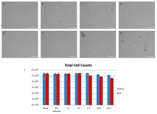 (A) Basal human adipose derived stem cells (ADSCs) in vitro culture (non-induced). (B–D) human ADSCs induced with 0.5 μM AECK time points captured at 3, 5 and 24 h respectively. Time course shows minimal structural changes and some cellular contraction producing cells in (D) which are marginally more slender than those in (A). (E) Basal human ADSCs in vitro culture (non-induced). (F–H) human ADSCs induced with 0.6 μM lanthionine ketamine (LK) time points captured at 3, 5, and 24 h respectively. Time course adequately exhibits large structural reconfiguration of ADSCs during differentiation. Cells display bipolar elongation, process, and spindle formation. Microscopy images using a 10× objective lens; scale bar 100 μm. (I) The cell count for the time course of each treatment AECK (blue) and LK (red).