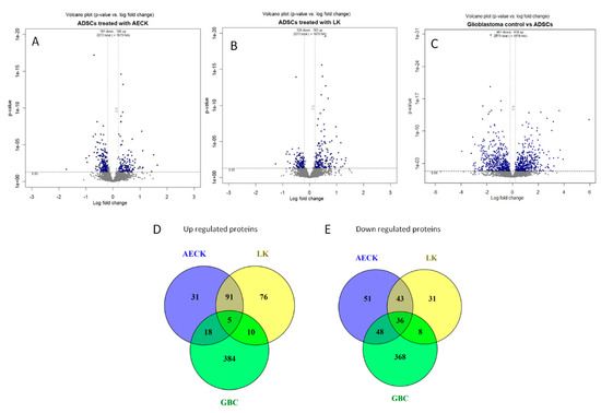 Volcano plots (A–C) showing p-values versus protein fold change (log2) of ADSCs and comparisons generated with DanteR. Quantitation criteria cutoff of statistically significant p-values < 0.05 and fold change log2 ratio cutoff of <−0.2 or >0.2. The blue nodes represent the above >0 log fold change, i.e., up-regulated proteins and the below <0 fold change down-regulated proteins. The grey nodes represent the not significantly changed proteins with a p-value > 0.05 and within the cut off for fold change. (D,E) Three-way Venn diagrams of up and down regulated proteins. Diagrams include the AECK treated, LK treated hADSCs, and the GBCs showing unique and shared proteins. (D) up regulated proteins revealing there are 31, 76, 384 with 91, 10, 18 shared proteins between each of the corresponding tested cell lines as well as 5 shared proteins between all three relative to basal hADSCs. (E) down regulated proteins revealing there are 51, 31, and 368 unique proteins with 43, 8, and 48 shared proteins between each of the corresponding tested cell lines as well as 36 shared proteins between all three relative to basal hADSCs.