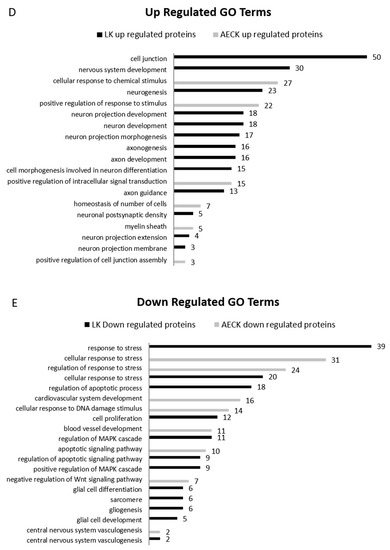 Interaction Networks (A) Presents the iTRAQ dataset of 2430 unique proteins nodes each individually colored with a cumulative 90,855 annotated or canonical interactions between proteins across the network presented in grey edge lines. (B) Presents the iTRAQ dataset of the full network with all up-regulated protein nodes present in blue and down-regulated protein nodes in red. (C) Presents the AECK unique protein nodes as “triangles”, LK protein nodes as squares and shared protein nodes as “circles”. This is in conjunction with the color indication of up regulated proteins in blue and down regulated in red. (D,E) number of up and down regulated proteins by GO terms respectively.