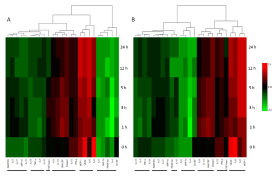 Hierarchical correlation and grouping of up/down regulated cytokines and interleukins secretions from basal ADSCs and temporal differentiation with (A) AECK neural differentiation media (B) LK neural differentiation media. Hierarchical clustering by Euclidean test Red: expression above median; Green: expression below the median; Black: median expression across all samples.