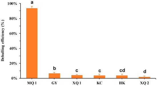 Dehulling efficiency of different Tartary buckwheat seeds. MQ 1, Miqiao 1; GY, Guyuan; XQ 1, Xiqiao 1; KC, Kuci; HK, Heiku; XQ 2, Xiqiao 2. Data are expressed as mean value ± standard deviation and sorted by dehulling efficiency value (n = 6). Different letters indicate significant difference between varieties (p < 0.05).