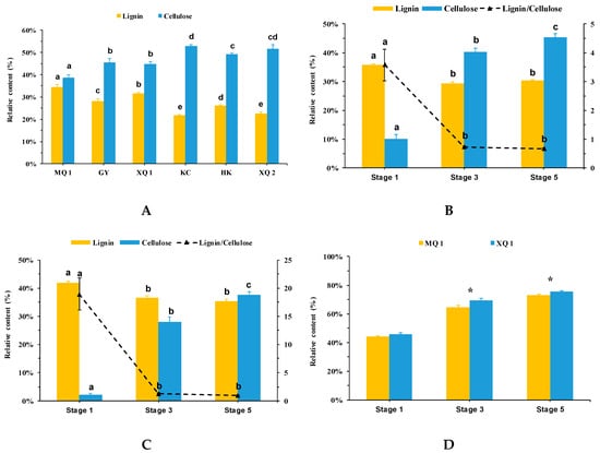 Lignin and cellulose content in the hull of Tartary buckwheat seed. S1, S3 and S5 indicate different developmental stages, stage 1, 3 and 5, of MQ 1 (M) and XQ 1 (X), respectively. (A) Lignin and cellulose content in the hull of mature seed (n = 3); (B,C) Lignin and cellulose content in the hull of different developmental stages of XQ 1 (B) and MQ 1 (C). Bars with different letter indicates significant differences (p < 0.05). (D) The total content of lignin and cellulose in the hull of XQ 1 and MQ 1 at each developmental stage; asterisk indicates the significant difference (p < 0.05) between XQ 1 and MQ 1.