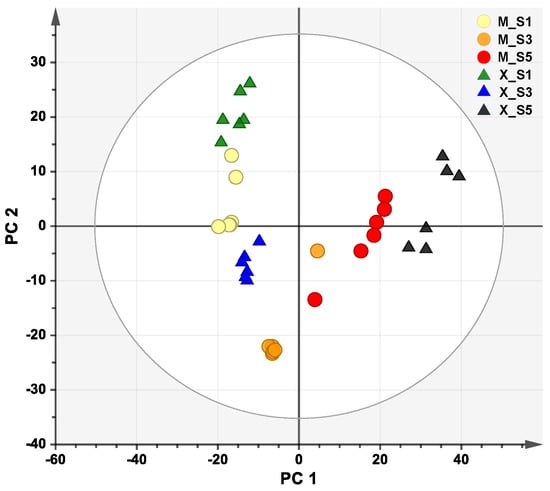 Principal component analysis (PCA) score plot. Each data point represents an independent sample. S1, S3 and S5 indicate different developmental stages, stage 1, 3 and 5, of MQ 1 (M) and XQ 1 (X), respectively. Ellipse was drew based on Hotelling’s T2 (95%).