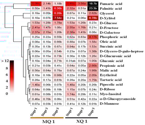 Hierarchically clustered heat map of differential expressed metabolites in the hull of different developmental stages. The relative content was normalized to the QC (quality control). The values with different letters show significant difference across the seed developmental stages both of XQ 1 and MQ 1.