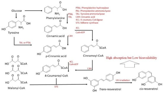 A review of literature has shown that resveratrol is synthesized by plants as a response to unfavorable or stressful conditions, damage, and mechanical injury. In the physiological metabolism of plants, glucose is metabolized to 4-coumaroyl-CoA and is combined with malonyl-CoA via stilbene synthase to produce trans-resveratrol (Figure 1). In response to bacteria or fungi or UV exposure, two forms of resveratrol can be produced, namely trans- and cis-isomers. In addition, while trans-resveratrol occurs naturally in grapes, various technologies have identified cis-resveratrol and its glucoside in wines of diverse origin. It was detected that the vinification process transforms some trans-resveratrol into its cis-form. Nevertheless, when protected from light, the trans-form can be stable for months, except in high pH, while cis-resveratrol was stable only in neutral pH []. In addition, resveratrol has been demonstrated to be a natural antimicrobial agent []. It also modulates gut microbiota composition and hence has anti-diabetic, anti-obesity, and anti-atherosclerosis properties [].