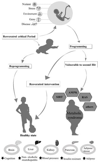 Metabolic syndrome is defined as central obesity plus any two of the following factors: elevated triglycerides, reduced High-density lipoproteins (HDL) cholesterol, elevated blood pressure or blood glucose abnormalities []. Metabolic syndrome is now considered a disease of developmental origin []. Developmental programming, also known as DOHaD [], refers to exposure during prenatal or early postnatal development that may cause permanent changes in an individual’s physiology and metabolism that predispose them to non-communicable diseases, such as Alzheimer’s, asthma, chronic kidney disease, and diabetes mellitus []. Reprogramming offers an opportunity, in the critical period of early development, to reverse this predisposition [,]. Tain et al. have previously reported on the potential role of melatonin in reprogramming metabolic syndrome following early perinatal insults. Reprogramming metabolic syndrome following early perinatal insults by resveratrol has also been reported. Signaling during reprogramming include SIRT1, Nrf2, and AMPK, all of which can be adjusted by resveratrol [,,]. We therefore in this review article discuss the role of resveratrol in the treatment of metabolic syndrome.
