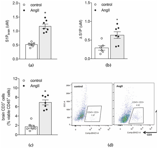 We recently reported that memory deficits in a mouse model of hypertension were not only accompanied by alterations in vascular structure and brain blood flow but also elevated transcript levels of pro-inflammatory cytokines and chemokines [2]. Amongst other potent chemoattractants [2], brain tissue of hypertensive mice presented with higher concentrations of S1P compared to normotensive controls (Figure 1a). Although hypertension also links to an increase in S1P plasma concentrations [7], the calculation of the difference between the concentration of brain S1P and plasma S1P (Δ [S1P]) revealed significantly higher values in the hypertensive group (Figure 1b), suggesting that hypertension promotes the development of stronger S1P gradients between brain tissue and circulating blood. Thus, S1P-governed immune cell chemotaxis might contribute to the elevated proportion of CD3+ T-cells we detected in hypertensive compared to normotensive brains using a FACS-based approached (Figure 1c,d).