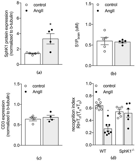 2.2. Genetic Depletion of S1P Generating Enzyme SphK1 Protects from AngII-Induced Increases in Brain S1P Levels and Memory Deficits