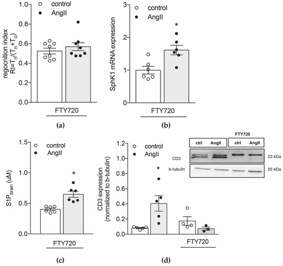 Because SphK1−/− mice show a blunted BP response to AngII (Figure S4), which might influence the cognitive readouts we set out to test our hypothesis in hypertensive WT mice where we pharmacologically inhibited T-cell mobilization from secondary lymphoid tissue using fingolimod (FTY720) [34]. Therefore, we treated hypertensive WT mice and normotensive controls with FTY720 (1mg/kg BW) for two constitutive weeks before memory function, immune cell status and S1P levels were determined. Despite inducing profound lymphopenia (Table S4), FTY720 did not affect BP levels [7] but prevented the development of memory deficits (Figure 3a). Similar to WT mice, AngII treatment induced significantly augmented sphk1 mRNA and protein expression (Figure 3b and Figure S5, respectively) and linked to elevated S1P levels in brain (Figure 3c). Interestingly, FTY720 treatment resulted in significantly higher baseline sphk2 mRNA levels in the brain compared to untreated normotensive WT mice (1.571 ± 0.097 vs. 1 ± 0.038; p = 0.0286; Table S5). This, however, did not translate to higher cerebral S1P concentrations (0.4026 ± 0.0502 in normotensive WT mice treated with FTY720 vs. 0.5376 ± 0.0333 in normotensive WT mice; p = 0.5969). Different from sphk1 expression (Figure 3b), AngII treatment did not affect sphk2 expressions following FTY720 treatment (Table S3), suggesting an SphK1-mediated increase of cerebral S1P concentrations in response to AngII. The calculated difference between S1P concentrations in brain and plasma revealed higher Δ [S1P] values in the hypertensive group (Figure S6) suggestive of S1P gradients similar to untreated hypertensive WT mice. Due to the lymphopenia induced by FTY720 (Table S4), CD3 brain expression did not change between normotensive and hypertensive mice (Figure 3d). Similar findings were obtained in lymphocyte-deficient Rag2−/− mice where AngII treatment associated to an elevation of S1P levels in the brain (Figure S7) whereas CD3 brain expression remained unaltered (Figure S8).